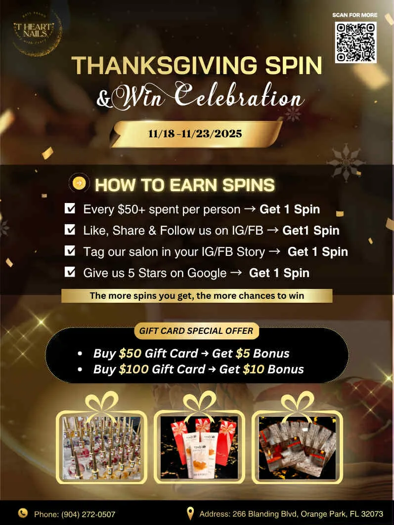 From November 18th - November 23rd, 2025, visit T Heart Nails and get your chance to spin and win amazing goodies! π
